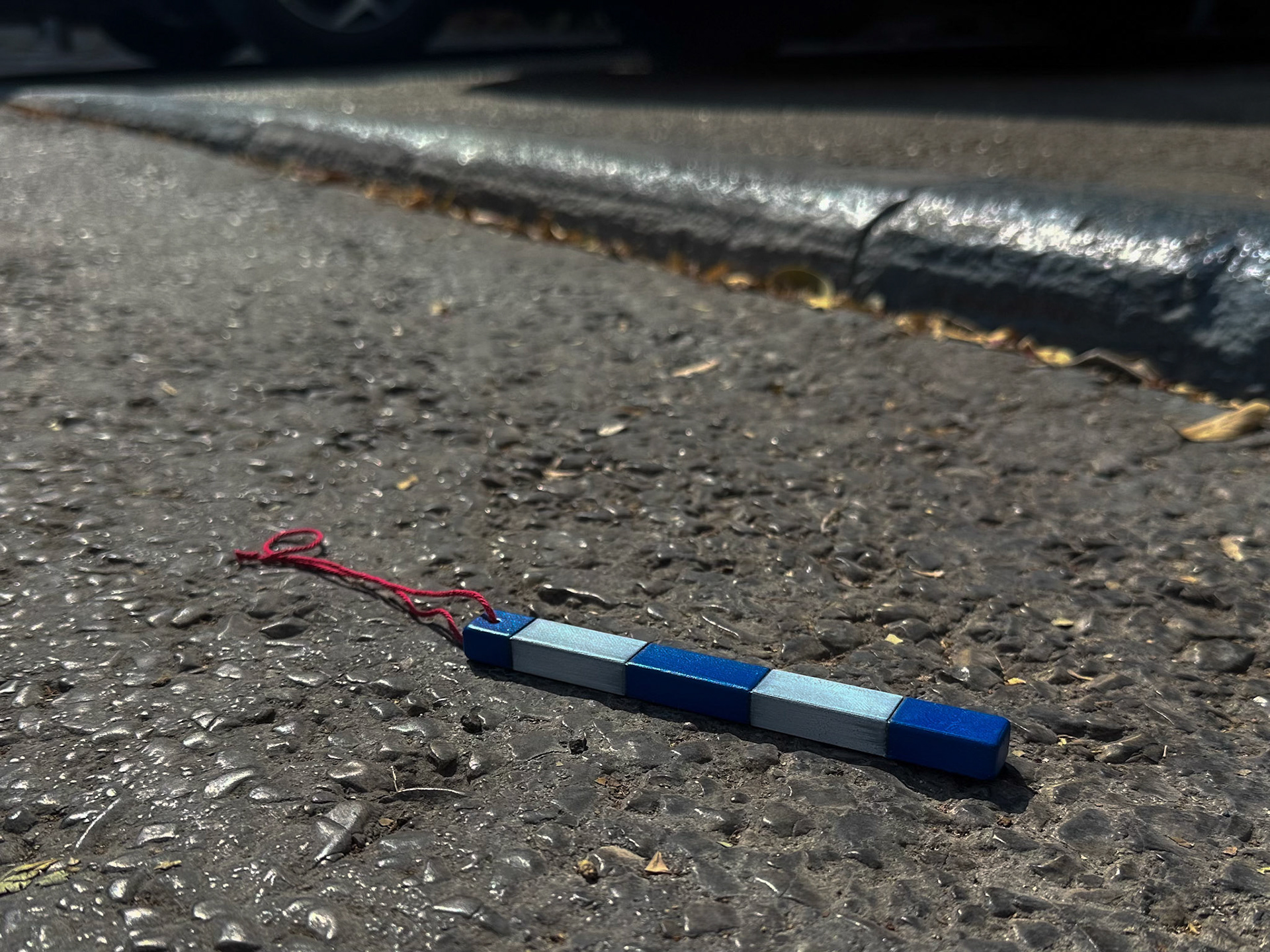 The amulet represents the painted sidewalk marking that permits parking, combined with a red cotton thread inspired by the traditional Jewish superstition bracelet.